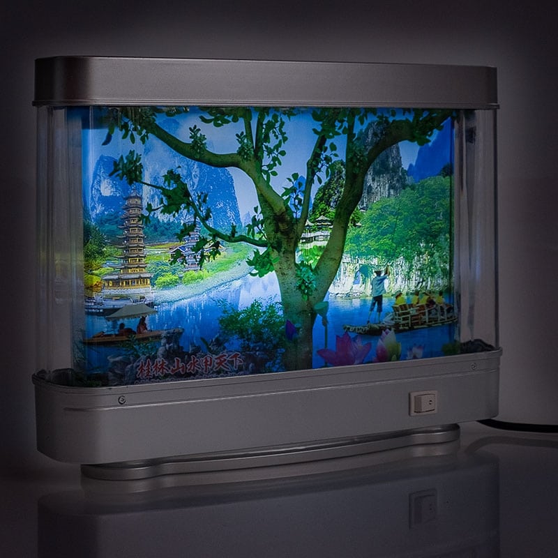 Διακοσμητικό φωτιστικό με περιστρεφόμενο τοπίο. Δώστε μια ξεχωριστή νότα διακόσμησης στον χώρο σας με ένα ιδιαίτερο φωτιστικό gadget. Ο πίνακας αυτός σας δίνει την δυνατότητα να στολίσετε τον χώρο σας με 2 διαφορετικά τοπία που θα σας χαλαρώσουν και θα σας ταξιδέψουν.Η μοναδικότητα αυτού του gadget βρίσκετε στο εσωτερικό του που περιστρέφει συνεχώς την εικόνα και στο εξωτερικό γυαλί του που δίνει μια κυματιστή όψη. Κατάλληλο για κάθε χώρο στο σπίτι η στο γραφείο.Λειτουργεί με ρεύμα. DOA 14 Ημερών